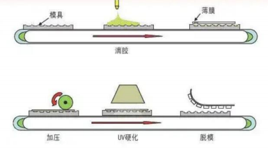 施胶 ?将UV胶水通过丝印,点胶等方式置于转印模具上。
