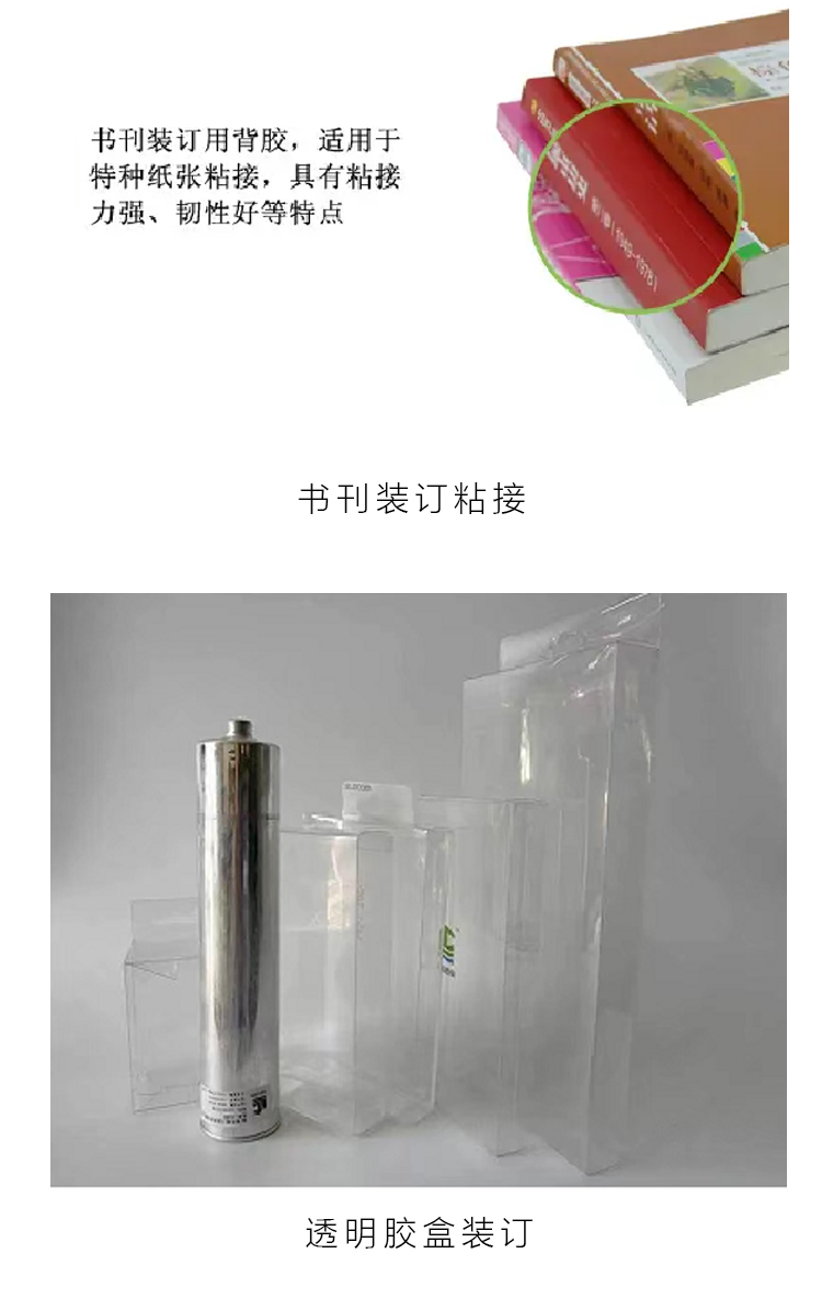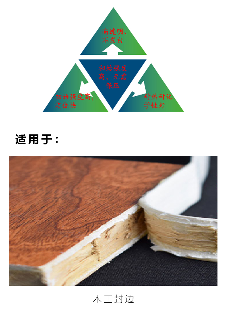 特别适合于透明盒及其制品等(PET、PVC、PP)的粘接,木工封边及书刊装订。